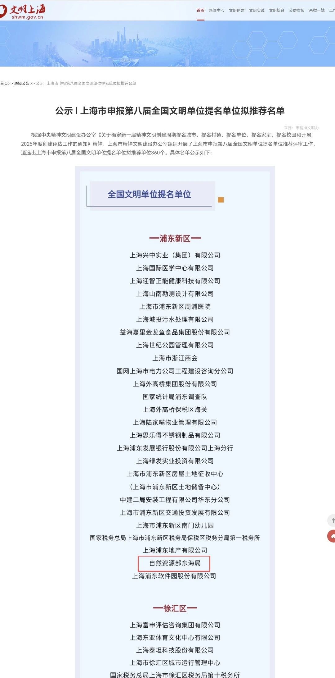 近日,上海市精神文明建设办公室组织开展了上海市申报第八届全国文明单位提名单位推荐评审工作,共遴选出上海市申报第八届全国文明单位提名单位拟推荐单位360个,自然资源部东海局上榜。