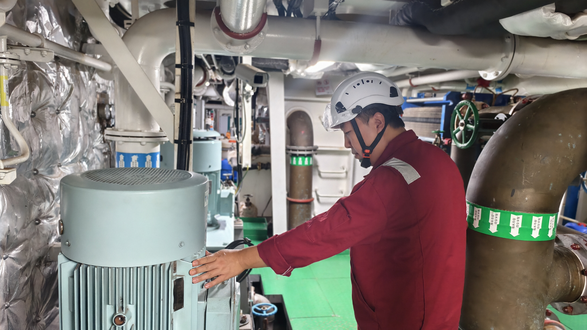 每台机器的功能不同,设备温度会随着环境温度和工作负荷的变化而变化,结合当时设备运行的状态和船舶所处海域环境,轮机员心中自有一把“标尺”去衡量机器是否正常。多年积累的手感,让他们的手掌如同精准的温度计。除了设备温度,机器运行的震动声也是判断依据,每天听,稍有异常便能立刻察觉。