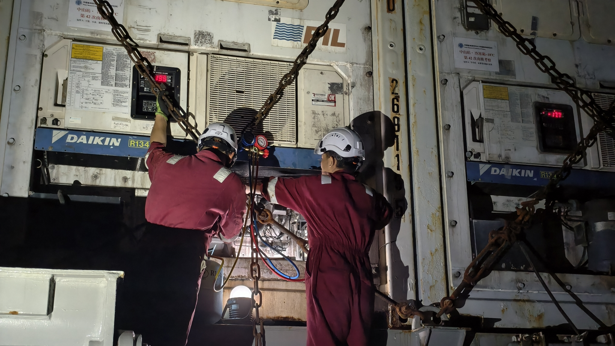 汤建国、许凯在维修冷藏集装箱。赵蕾 摄
